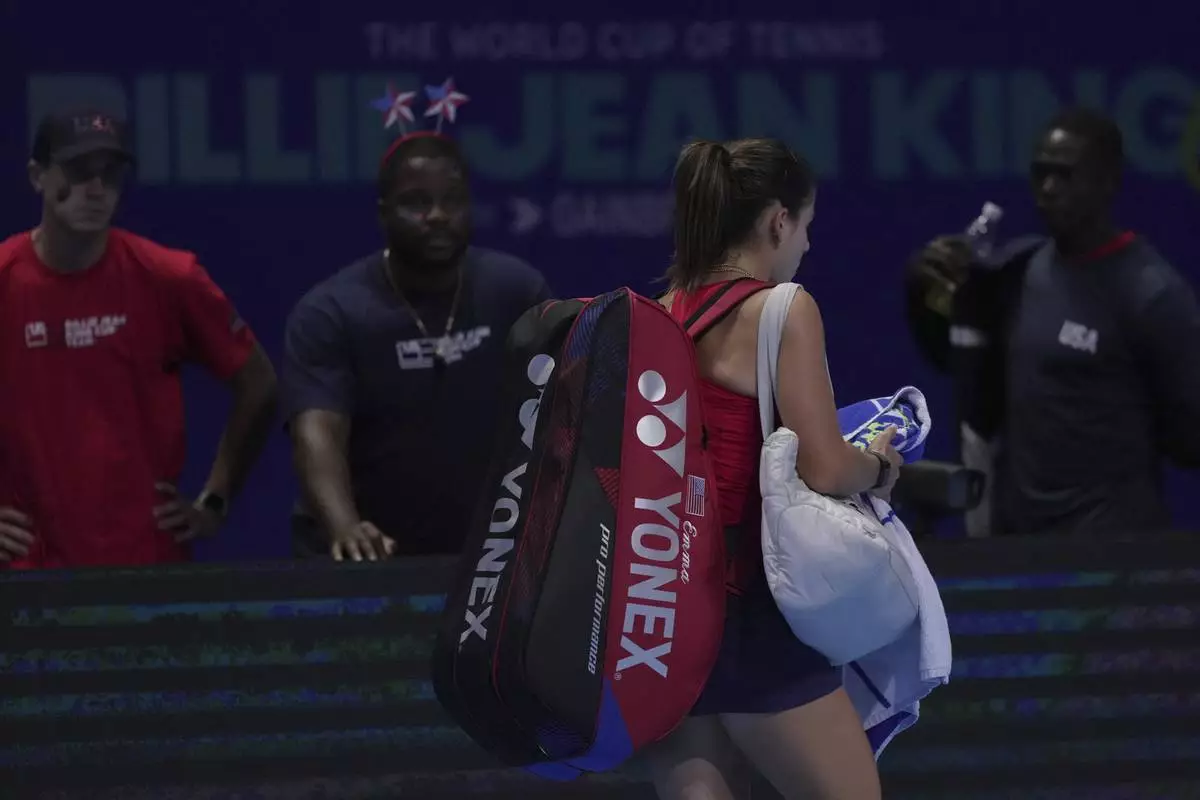 Emma Navarro, of the United States leaves the court after losing the Billie Jean King Cup final tennis match to Elisabetta Cocciaretto, of Italy, at the Shenzhen Bay Sports Center Arena, in Shenzhen, China's Guangdong province, Sunday, Sept. 21, 2025. (AP Photo/Andy Wong)