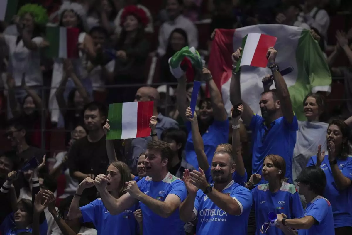 Italian supporters cheer after Jasmine Paolini, of Italy winning the first set against Jessica Pegula, of the United States during the Billie Jean King Cup final tennis match, at the Shenzhen Bay Sports Center Arena, in Shenzhen, China's Guangdong province, Sunday, Sept. 21, 2025. (AP Photo/Andy Wong)
