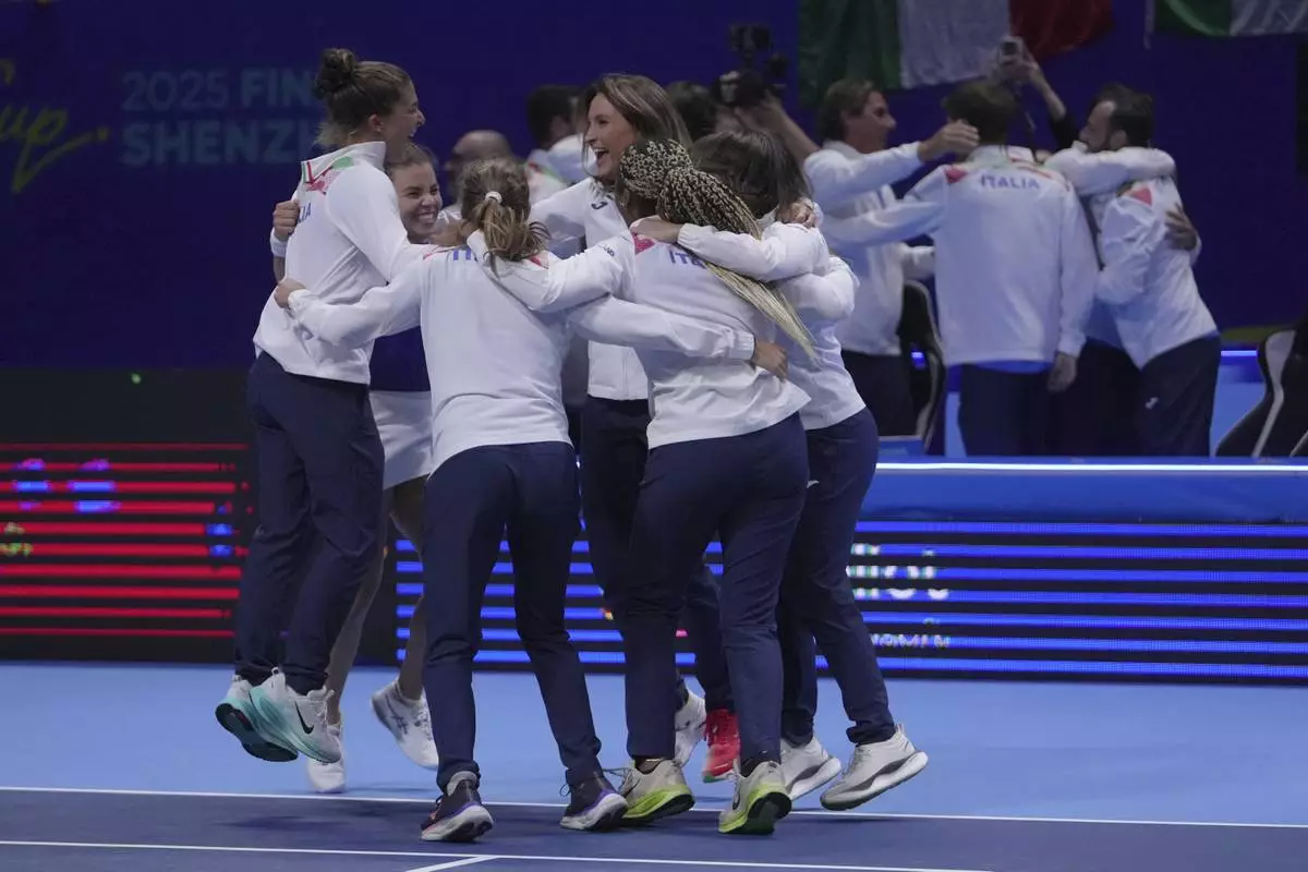 Italy's tennis team celebrate on court after winning the Billie Jean King Cup final against the United States' team, at the Shenzhen Bay Sports Center Arena, in Shenzhen, China's Guangdong province, Sunday, Sept. 21, 2025. (AP Photo/Andy Wong)