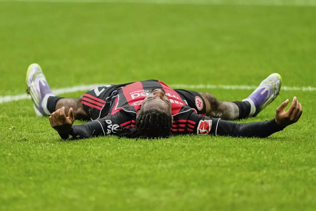 Frankfurt's Elye Wahi is on the ground during a German Bundesliga soccer match between Eintracht Frankfurt and Union Berlin in Frankfurt, Germany, Sunday, Sept. 21, 2025. (AP Photo/Michael Probst)