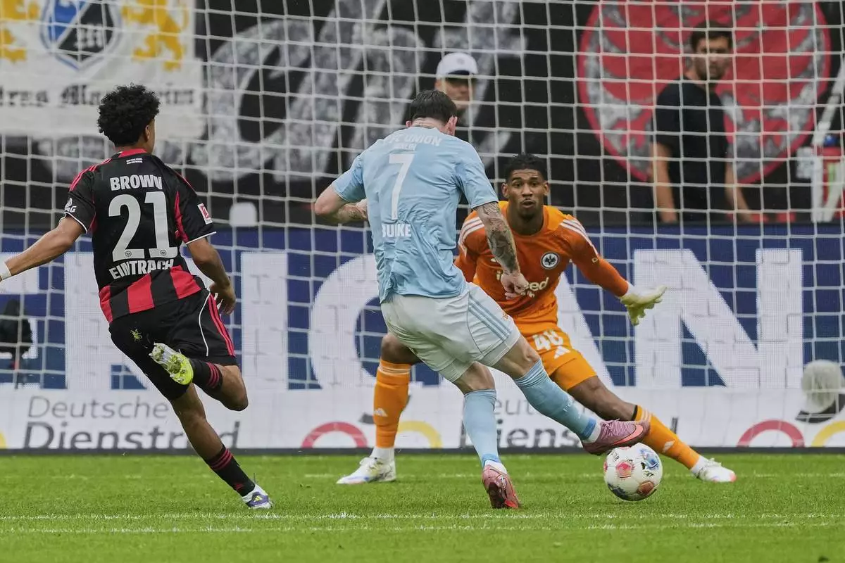 But Can Uzun pulled one back in the 80th and Frankfurt got a penalty when Jonathan Burkardt went down spectacularly. Leopold Querfeld had his hand near the Frankfurt forward’s neck and was penalized after a VAR check. Burkardt stayed cool to score from the spot in the 87th.