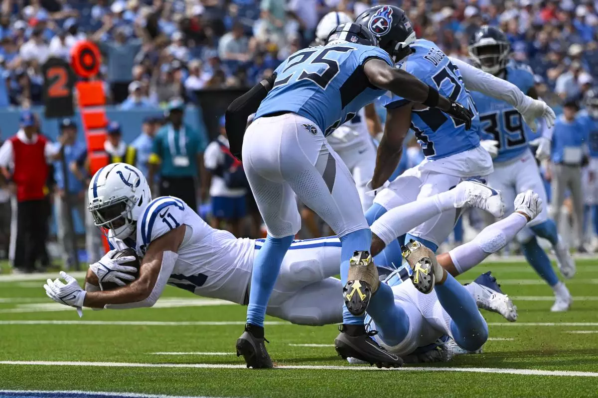 Indianapolis Colts wide receiver Michael Pittman (11) dives into the end zone for a touchdown against the Tennessee Titans during the second half of an NFL football game Sunday, Sept. 21, 2025, in Nashville, Tenn. (AP Photo/John Amis)
