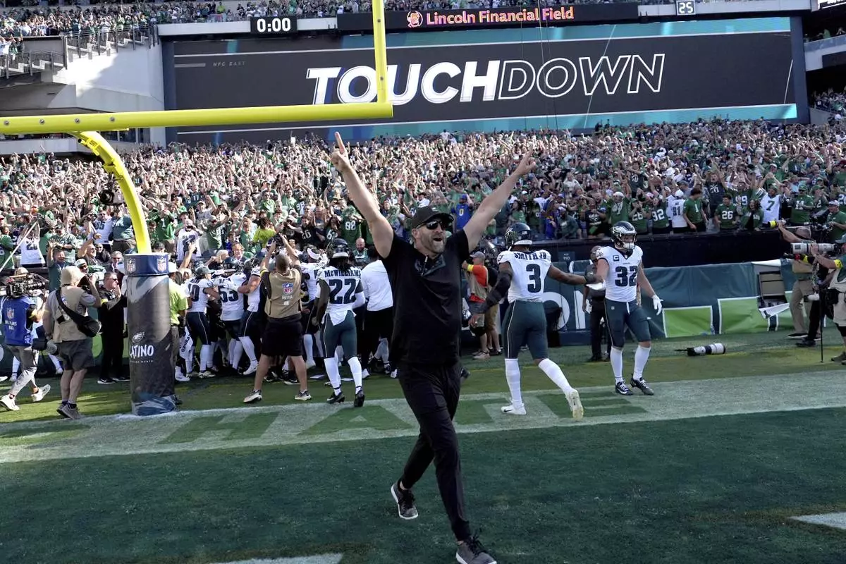 PHILADELPHIA (AP) — Jordan Davis clutched the ball in his outstretched right hand as he reached the end zone and had no choice but to freeze and meet the mob of Eagles sprinting his way.