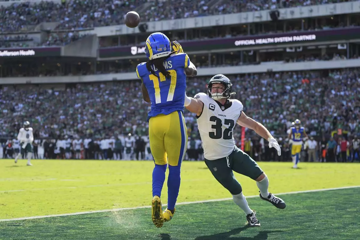 Los Angeles Rams wide receiver Davante Adams (17) catches a touchdown pass as Philadelphia Eagles safety Reed Blankenship (32) defends during the first half of an NFL football game Sunday, Sept. 21, 2025, in Philadelphia. (AP Photo/Matt Slocum)