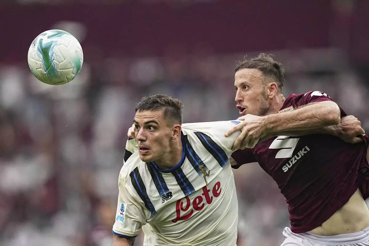Atalanta's Nikola Krstovic, left, fights for the ball with Torino's Ardian Ismajli during the Italian Serie A soccer match between Torino and Atalanta at the Stadio Olimpico Grande Torino in Torino, Italy, Sunday, Sept. 21, 2025. (Marco Alpozzi/LaPresse via AP)