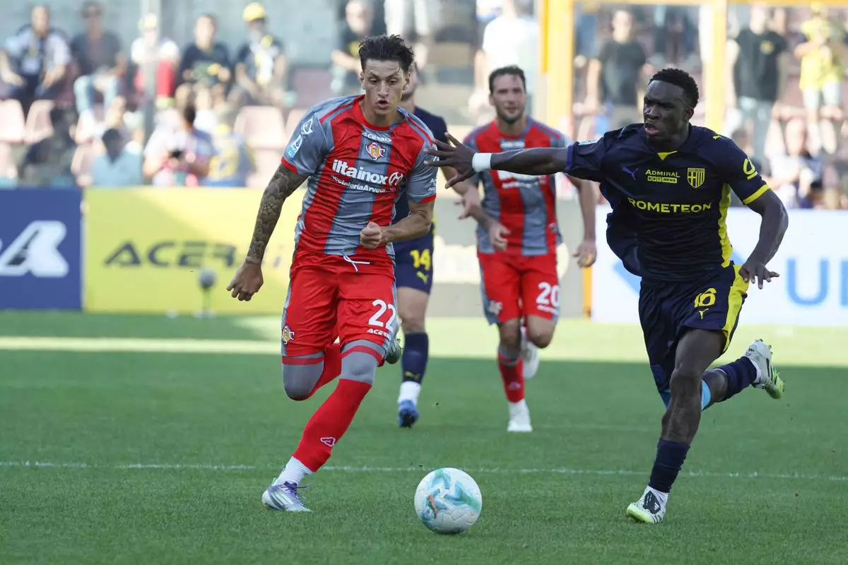 Cremonese's Romano Floriani Mussolini, left, and Parma's Mandela Keita in action during the Italian Serie A soccer match between Cremonese and Parma at the Giovanni Zini Stadium in Cremona, Italy, Sunday, Sept. 21, 2025. (Alberto Mariani/LaPresse via AP)