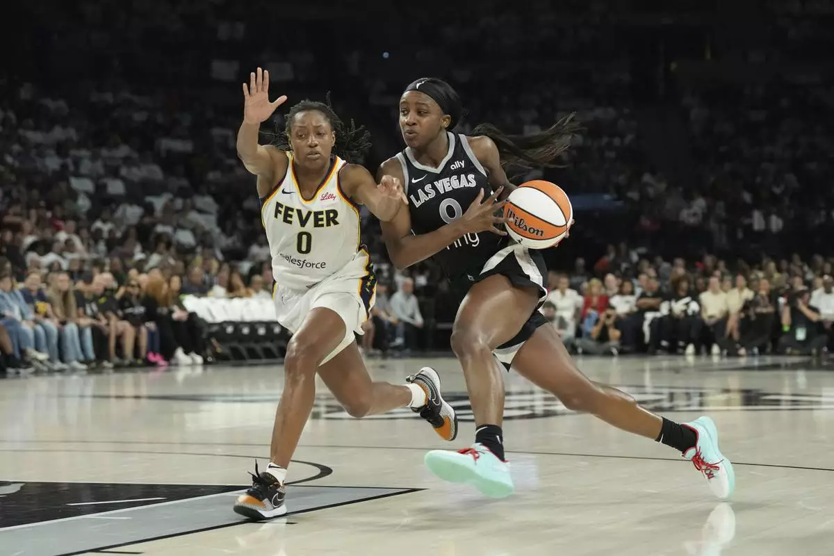 Las Vegas Aces guard Jackie Young, right, drives past Indiana Fever guard Kelsey Mitchell, left, in the first half of Game 1 of a WNBA basketball playoff semifinals series Sunday, Sept. 21, 2025, in Las Vegas. (AP Photo/Candice Ward)