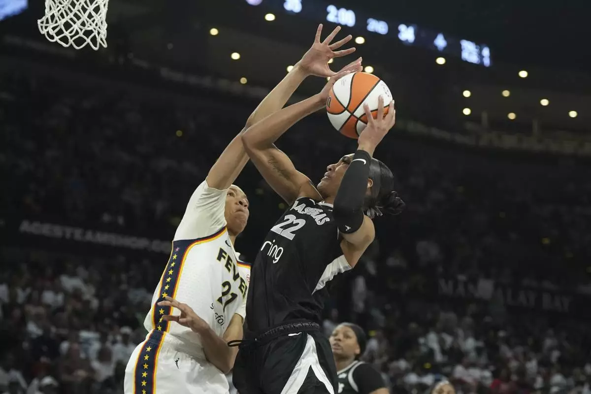 Las Vegas Aces center A'ja Wilson (22) looks to shoot against Indiana Fever forward Makayla Timpson, left, in the first half of Game 1 of a WNBA basketball playoff semifinals series Sunday, Sept. 21, 2025, in Las Vegas. (AP Photo/Candice Ward)
