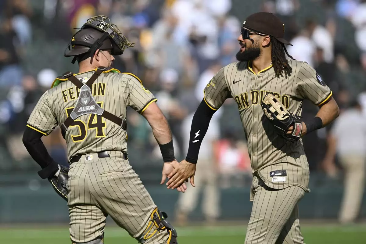 San Diego Padres' Fernando Tatis Jr., right, celebrates with catcher Freddy Fermin (54) after defeating the Chicago White Sox in a baseball game Sunday, Sept. 21, 2025, in Chicago. (AP Photo/Paul Beaty)