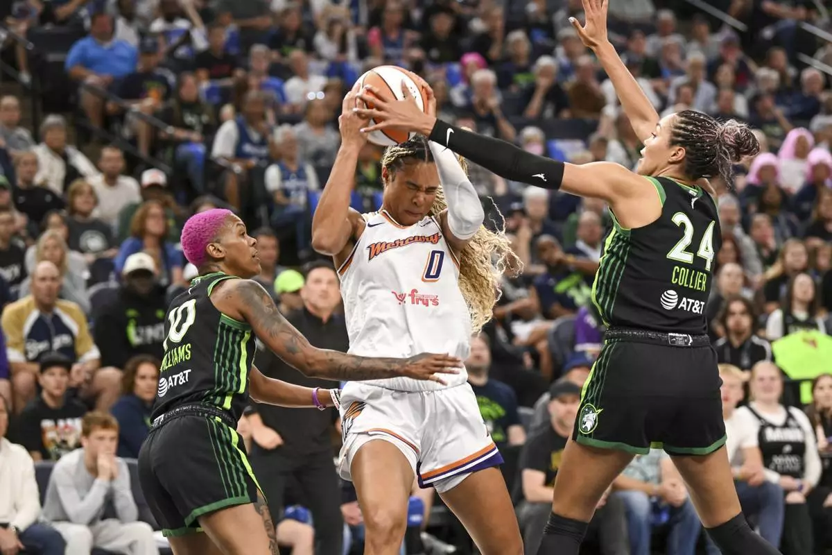 Phoenix Mercury forward Satou Sabally (0) is boxed in by Minnesota Lynx guard Courtney Williams, left, and forward Napheesa Collier (24) during the first half of Game 1 of a WNBA basketball playoff semifinals series Sunday, Sept. 21, 2025, in Minneapolis. (AP Photo/Craig Lassig)