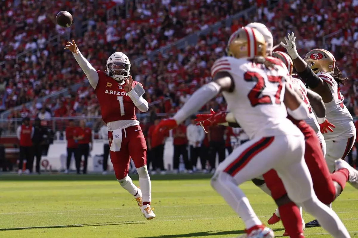Arizona Cardinals quarterback Kyler Murray, left, throws a touchdown pass during the second half of an NFL football game against the San Francisco 49ers, Sunday, Sept. 21, 2025, in Santa Clara, Calif. (AP Photo/Sergio Estrada)
