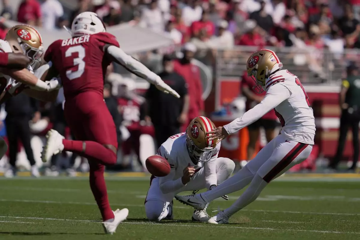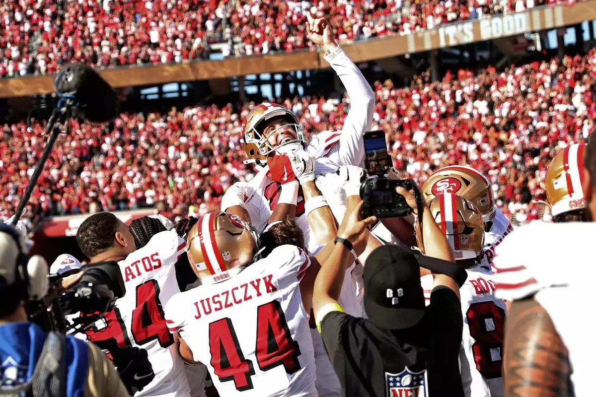 SANTA CLARA, Calif. (AP) — The San Francisco 49ers had lost another star to an injury, given up a fourth-quarter lead on a safety and were relying on a backup quarterback and a brand new kicker to maintain their perfect start to the season.