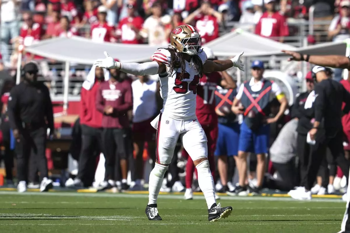 San Francisco 49ers middle linebacker Fred Warner reacts after batting down a pass during the second half of an NFL football game against the Arizona Cardinals, Sunday, Sept. 21, 2025, in Santa Clara, Calif. (AP Photo/Godofredo A. Vásquez)