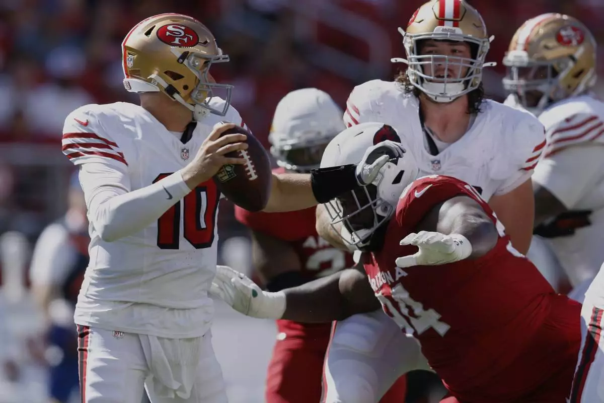 San Francisco 49ers quarterback Mac Jones, left, avoids a tackle by Arizona Cardinals defensive end Dalvin Tomlinson during the second half of an NFL football game Sunday, Sept. 21, 2025, in Santa Clara, Calif. (AP Photo/Sergio Estrada)