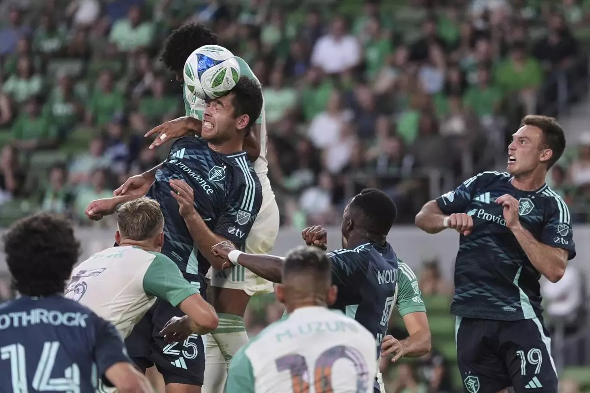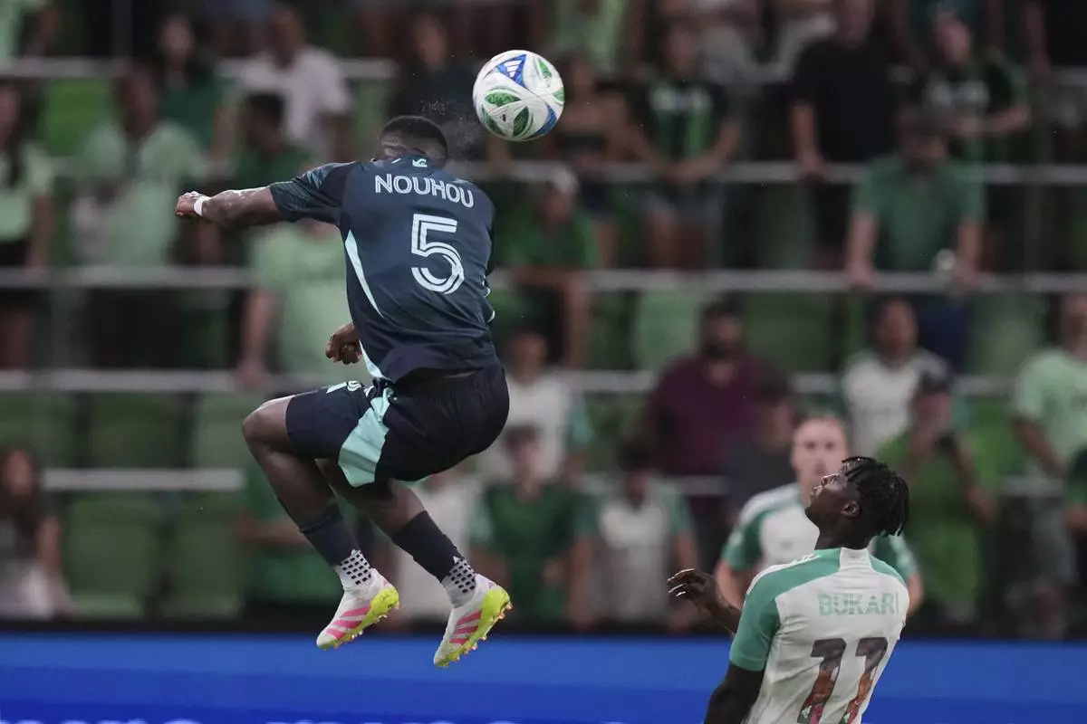 Seattle Sounders' Nouhou Tolo (5) heads a pass over Austin FC midfielder Samuel Gustafson (11) during the second half of an MLS soccer match in Austin, Texas, Sunday, Sept. 21, 2025. (AP Photo/Eric Gay)