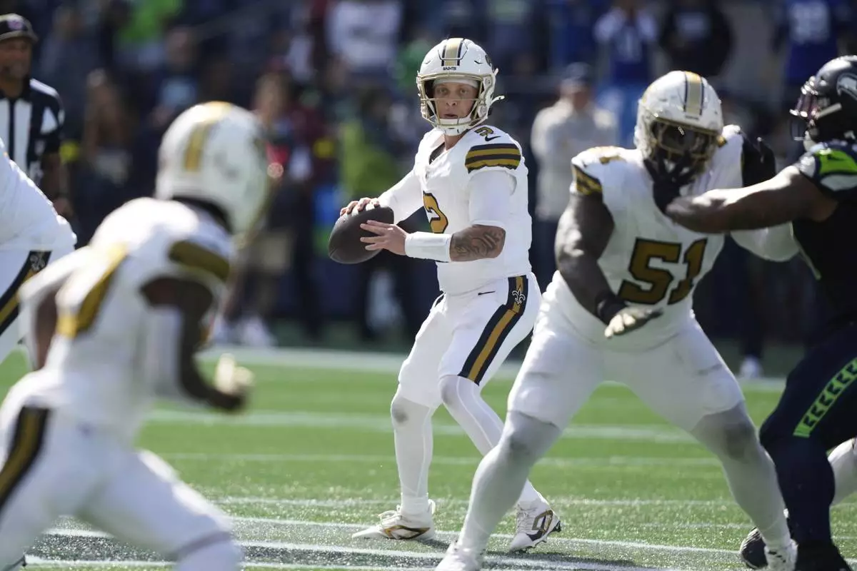 New Orleans Saints quarterback Spencer Rattler (2) drops back to pass during the first half of an NFL football game against the Seattle Seahawks, Sunday, Sept. 21, 2025, in Seattle. (AP Photo/Stephen Brashear)