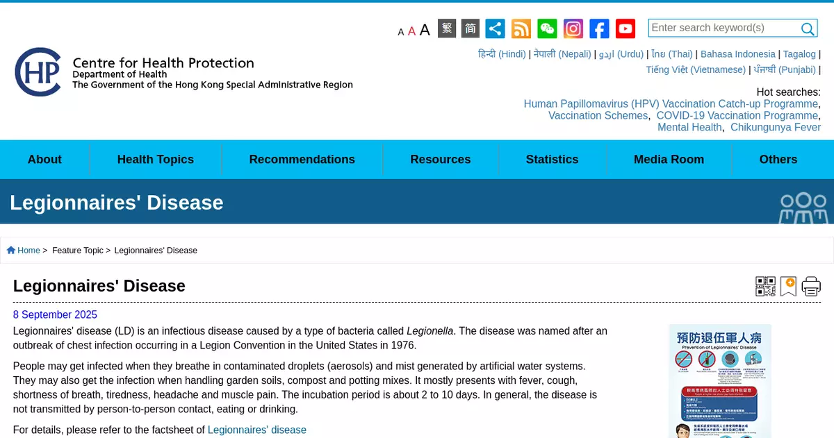 The Centre for Health Protection (CHP) of the Department of Health today (September 22) reported the latest number of cases of Legionnaires' disease (LD), and reminded the public of the importance of using and maintaining properly designed man-made water systems, adding that susceptible groups should strictly observe relevant precautions.