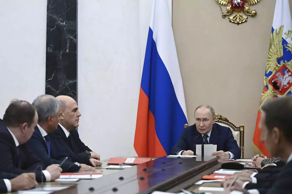 Russian President Vladimir Putin, center, chairs a Security Council meeting at the Kremlin in , Russia, Monday, Sept. 22, 2025. (Alexander Kazakov, Sputnik, Kremlin Pool Photo via AP)