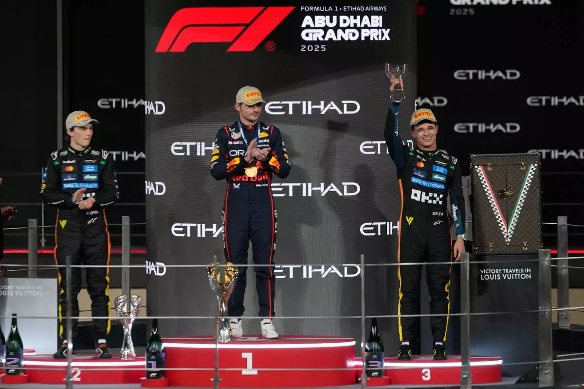 Race winner Red Bull driver Max Verstappen of the Netherlands, center, poses on the podium with second placed McLaren driver Oscar Piastri of Australia, left, and third placed McLaren driver Lando Norris of Britain after the Formula One Abu Dhabi Grand Prix at the Yas Marina Circuit in Abu Dhabi, UAE, Sunday, Dec. 7, 2025. (AP Photo/Altaf Qadri)