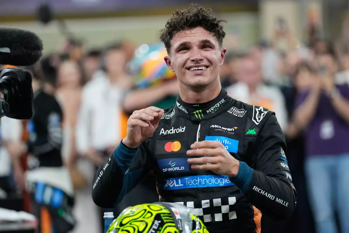 McLaren driver Lando Norris of Britain celebrates after becoming a world champion after the Formula One Abu Dhabi Grand Prix at the Yas Marina Circuit in Abu Dhabi, UAE, Sunday, Dec. 7, 2025. (AP Photo/Altaf Qadri)