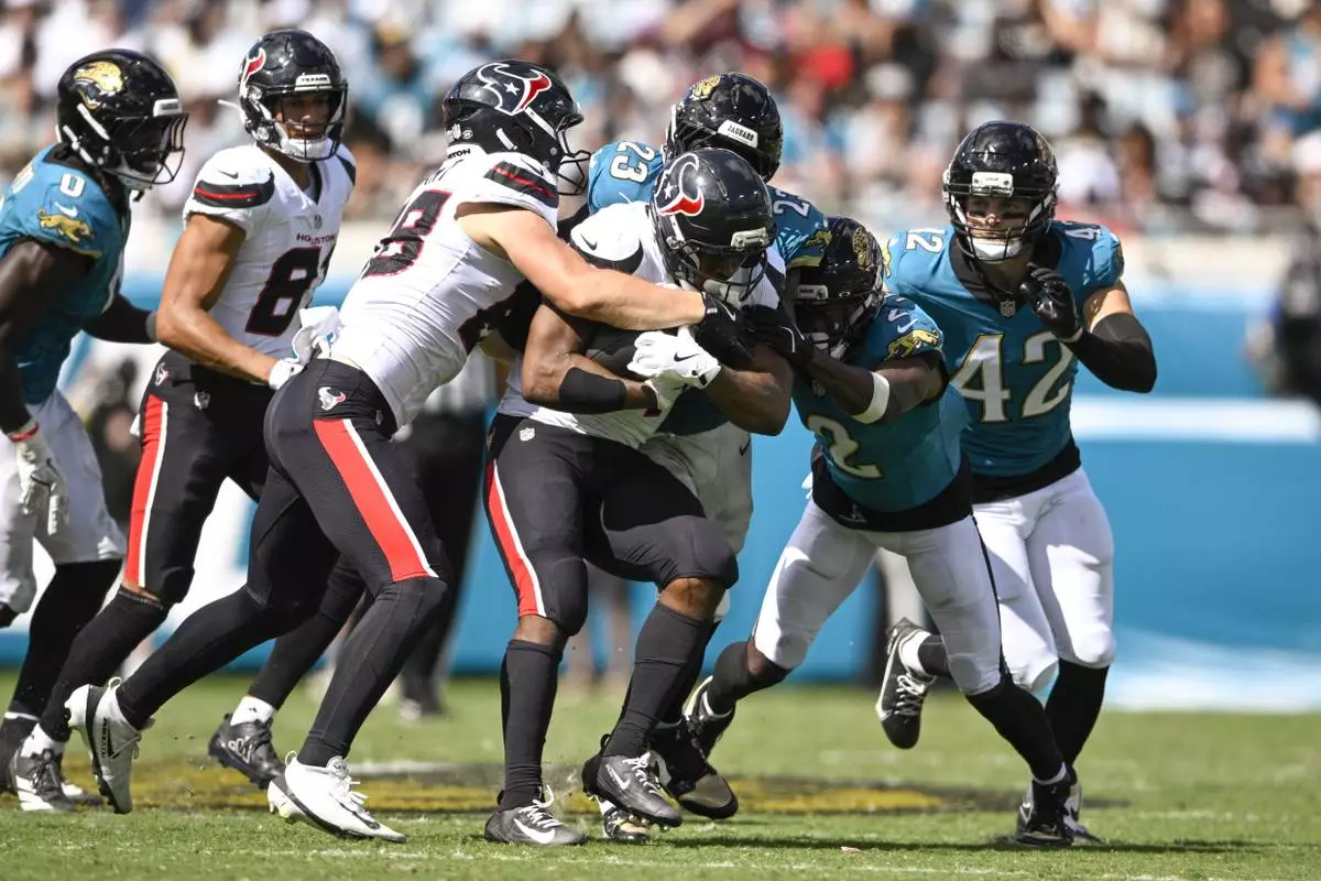 Houston Texans running back Nick Chubb, center, is stopped by Jacksonville Jaguars linebacker Foye Oluokun (23), cornerback Jourdan Lewis (2) and safety Andrew Wingard (42) during the second half of an NFL football game Sunday, Sept. 21, 2025, in Jacksonville, Fla. (AP Photo/Phelan M. Ebenhack)