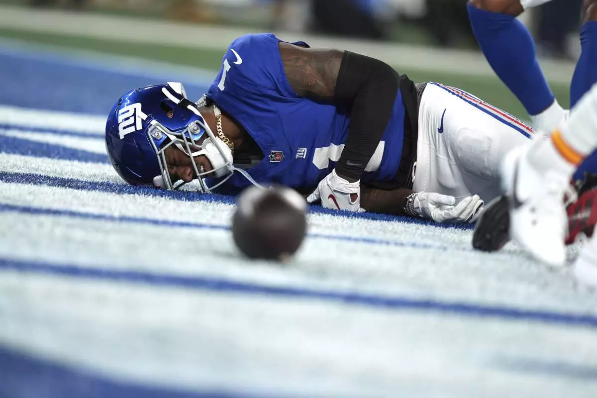 New York Giants wide receiver Malik Nabers (1) is slow to get up after being injured during the second half of an NFL football game against the Kansas City Chiefs Sunday, Sept. 21, 2025, in East Rutherford, N.J. (AP Photo/Seth Wenig)