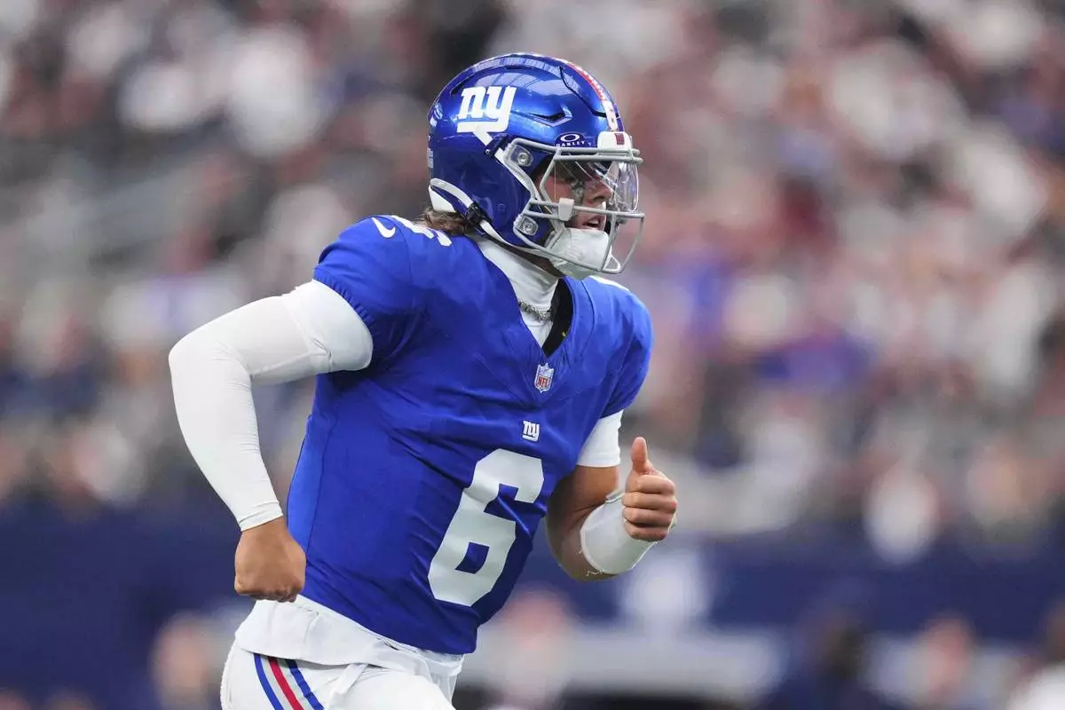 New York Giants quarterback Jaxson Dart (6) follows the play in the second half of an NFL football game against the Dallas Cowboys Sunday, Sept. 14, 2025, in Arlington, Texas. (AP Photo/Julio Cortez)
