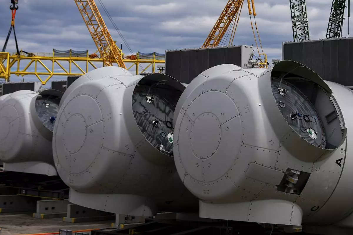 FILE - Wind turbine components sit at New London State Pier, April 16, 2025, in New London, Conn. (AP Photo/Julia Demaree Nikhinson, File)