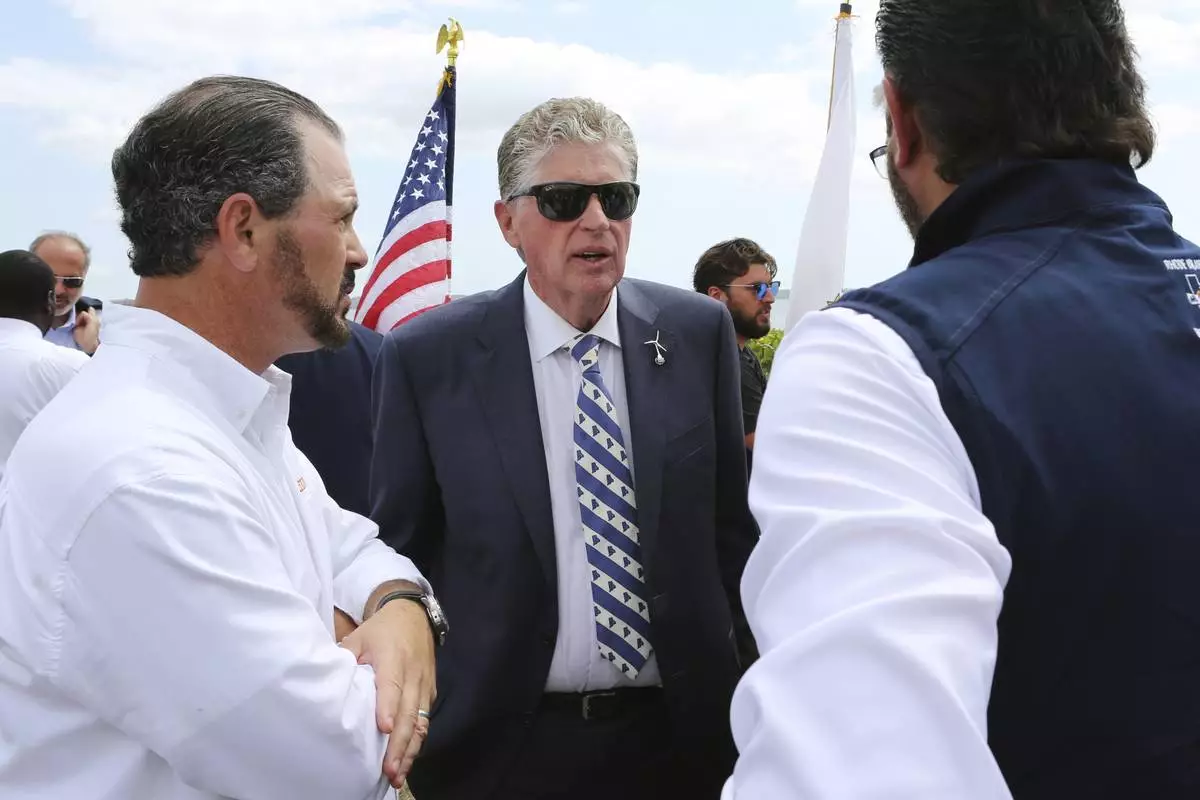 FILE - Rhode Island Gov. Dan McKee, center, speaks with Laborers' International Union of North America leaders Donato Bianco, left, and Michael Sabitoni, right, after a news conference in North Kingstown, R.I., on Aug. 25, 2025. (AP Photo/Jennifer McDermott, File)