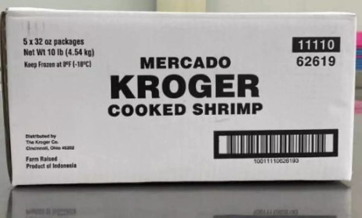 This undated photo released by the U.S. Food and Drug Administration, FDA, shows a product label for Kroger Mercado Cooked Medium Peeled Tail-Off Shrimp. (FDA via AP)