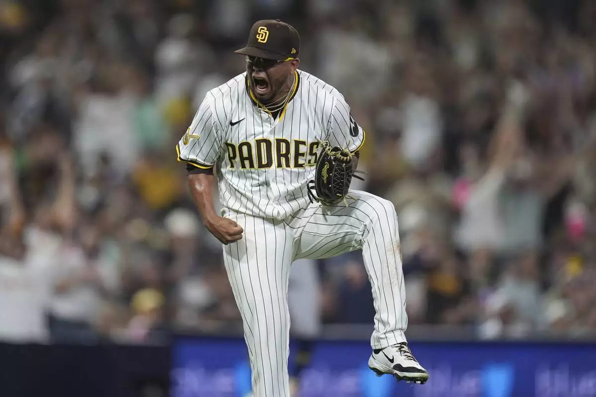 San Diego Padres relief pitcher Bradgley Rodriguez celebrates after the third out during the eleventh inning of a baseball game against the Milwaukee Brewers Monday, Sept. 22, 2025, in San Diego. (AP Photo/Gregory Bull)