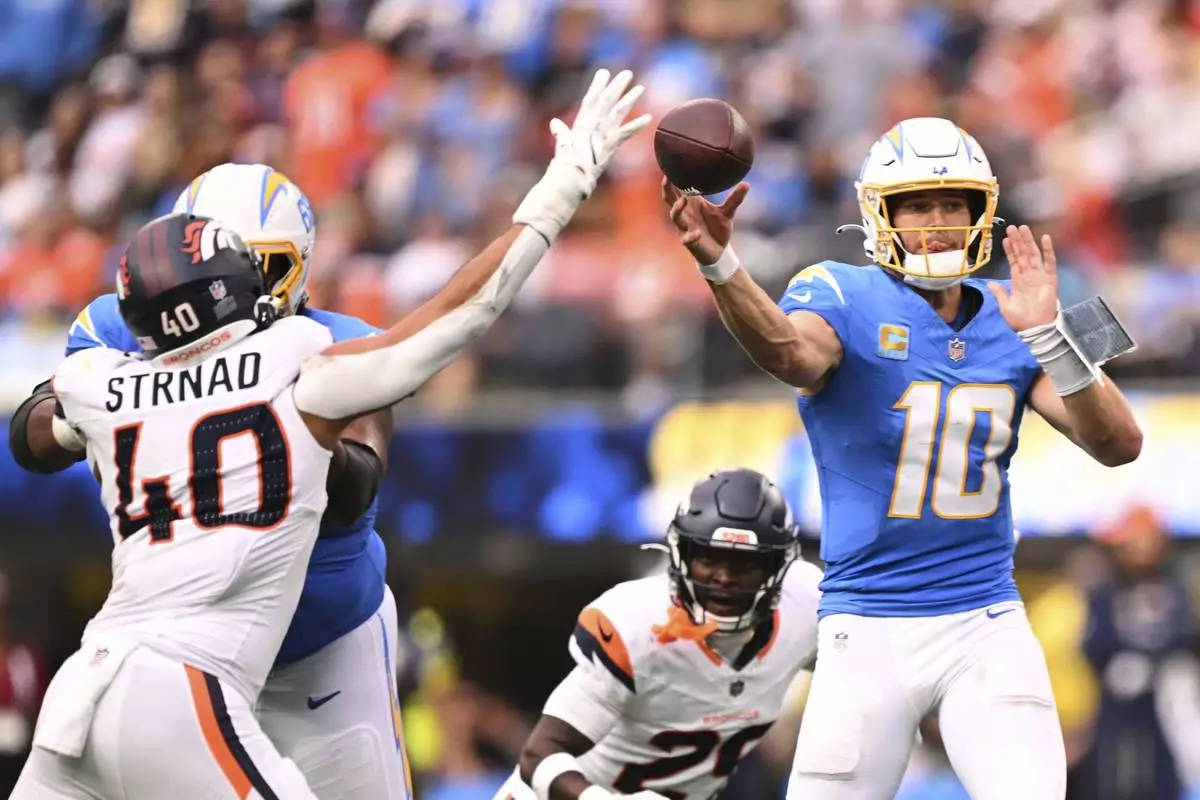 Los Angeles Chargers quarterback Justin Herbert (10) throws a pass during the second half of an NFL football game against the Denver Broncos, Sunday, Sept. 21, 2025, in Inglewood, Calif. (AP Photo/Carrie Giordano )