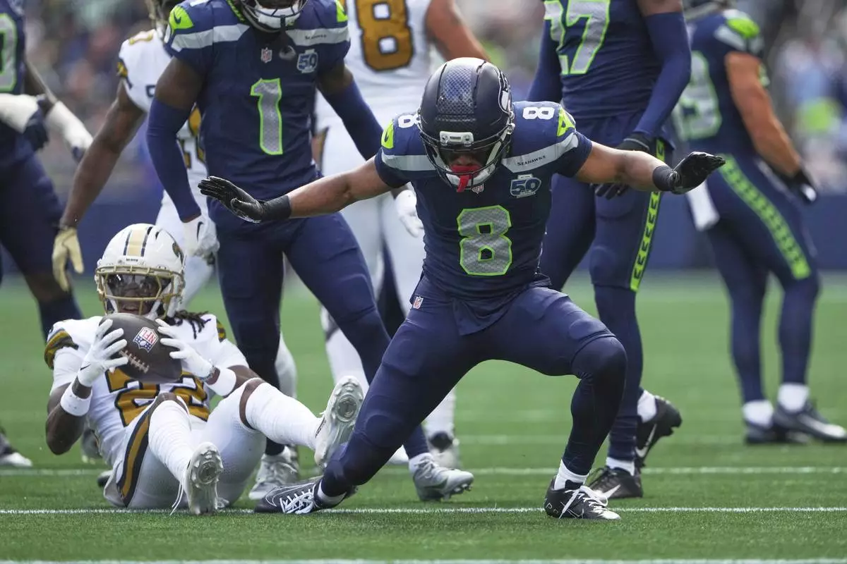 Seattle Seahawks safety Coby Bryant (8) reacts after tackling New Orleans Saints wide receiver Rashid Shaheed (22) during the first half of an NFL football game, Sunday, Sept. 21, 2025, in Seattle. (AP Photo/Lindsey Wasson)