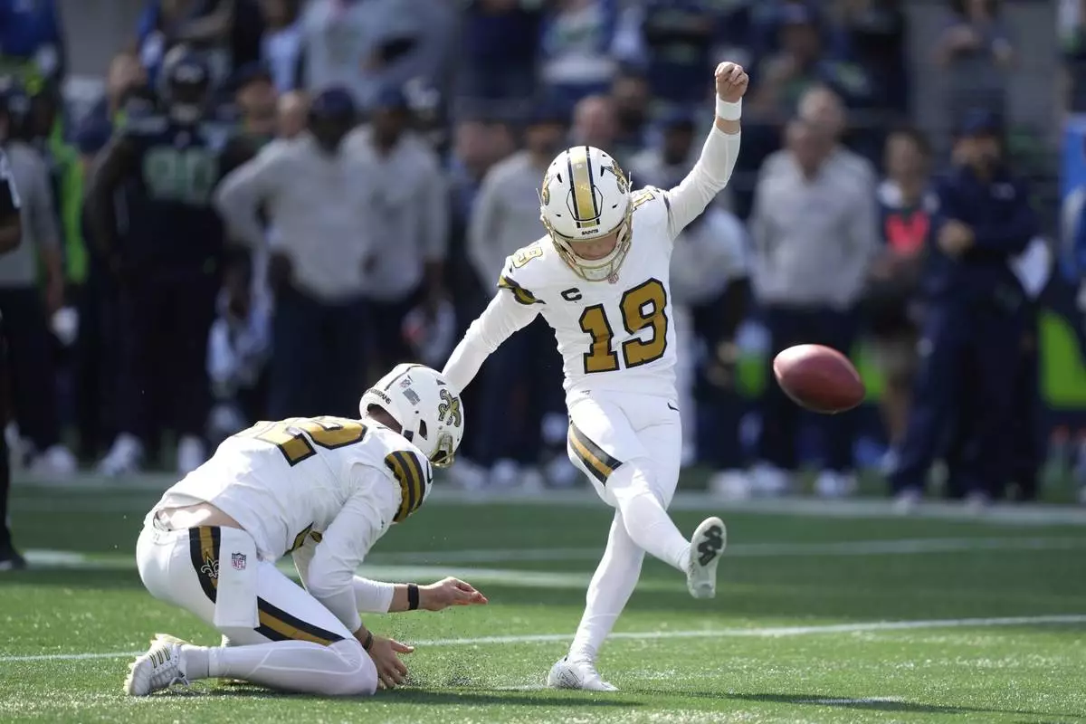 New Orleans Saints place-kicker Blake Grupe (19) kicks a field goal during the first half of an NFL football game against the Seattle Seahawks, Sunday, Sept. 21, 2025, in Seattle. (AP Photo/Stephen Brashear)