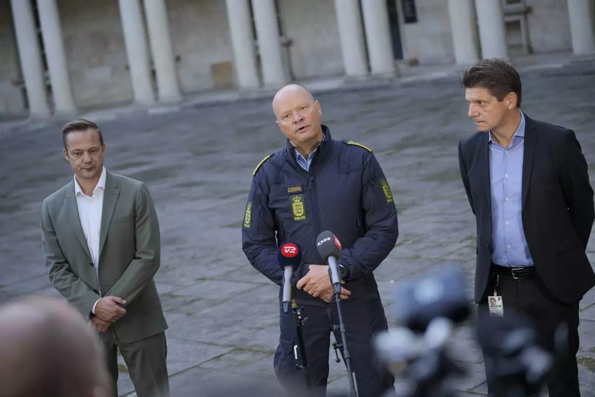 Naviair Director Morten Fruensgaard, left, police inspector Jens Jespersen, centre, and operations manager at Naviair Kristoffer Plenge-Brandt hold a joint press conference at police headquarters in Copenhagen, Denmark, Tuesday Sept. 23, 2025, after drones were seen on Monday evening near Copenhagen Airport and the airspace over Copenhagen was closed for four hours into Tuesday. (Emil Helms/Ritzau Scanpix via AP)