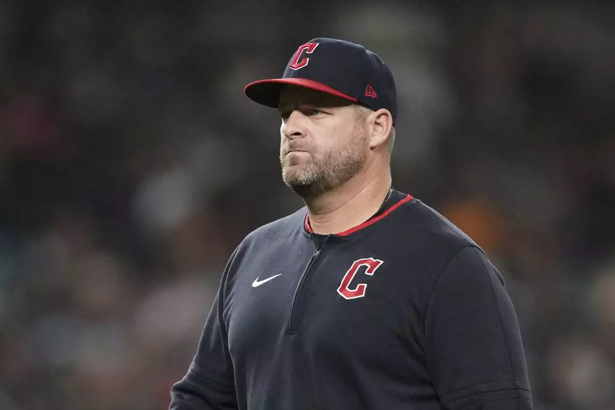 Cleveland Guardians manager Stephen Vogt watches against the Detroit Tigers during the sixth inning of a baseball game Wednesday, Sept. 17, 2025, in Detroit. (AP Photo/Paul Sancya)