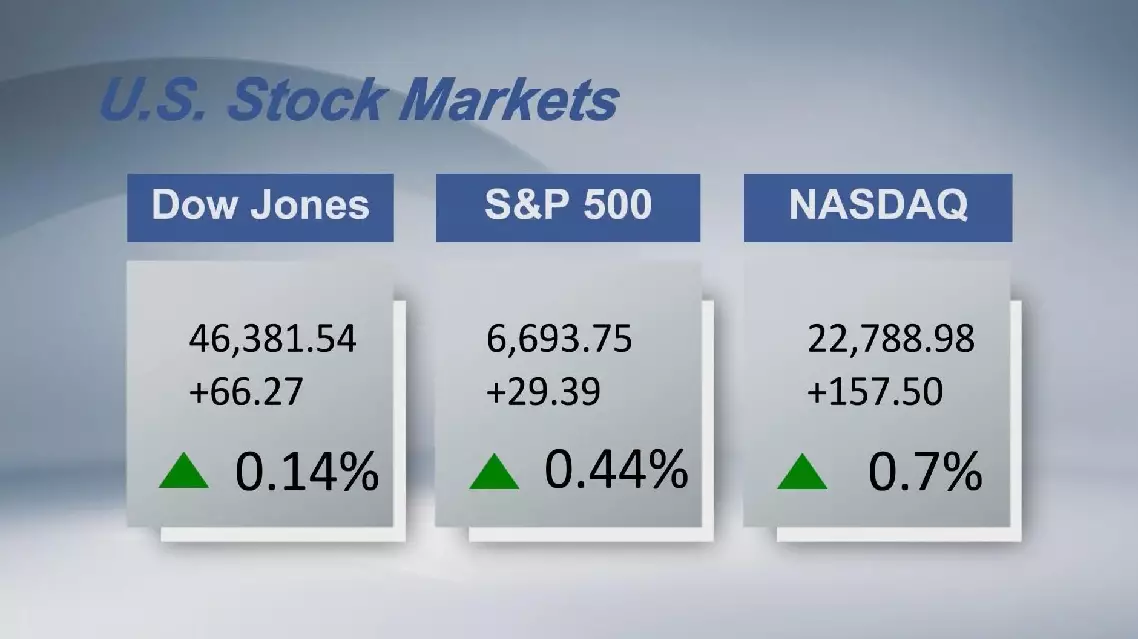 The Dow Jones Industrial Average rose 66.27 points, or 0.14 percent, to 46,381.54. The S&P 500 added 29.39 points, or 0.44 percent, to 6,693.75. The Nasdaq Composite Index increased 157.50 points, or 0.7 percent, to 22,788.98. All three major averages posted their third straight session of fresh record closes.