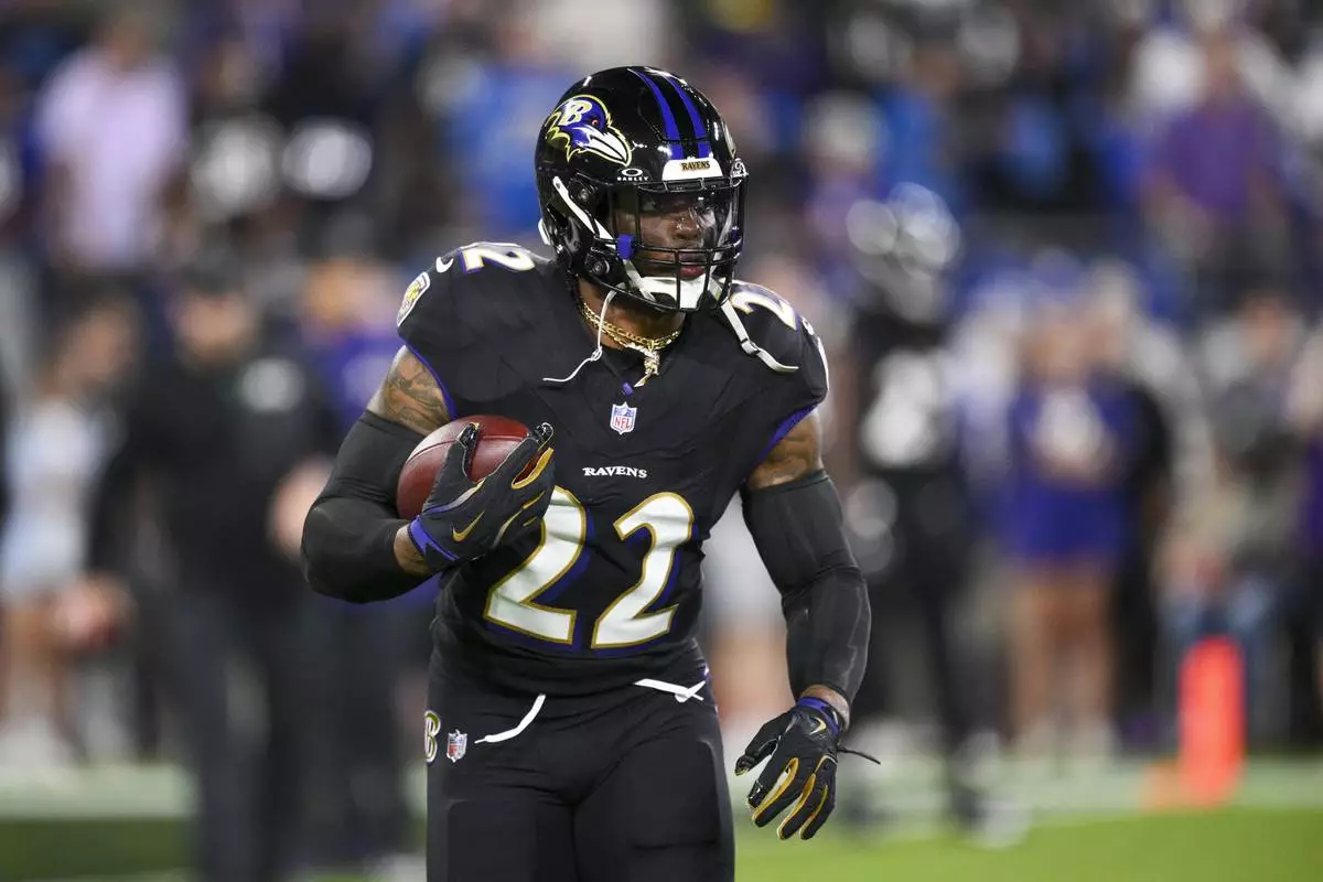 Baltimore Ravens running back Derrick Henry works out prior to an NFL football game against the Detroit Lions Monday, Sept. 22, 2025, in Baltimore. (AP Photo/Nick Wass)
