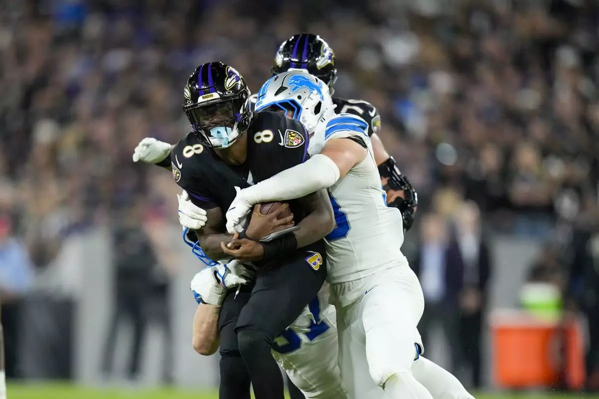 Baltimore Ravens quarterback Lamar Jackson (8) is brought down by Detroit Lions linebacker Trevor Nowaske, right, and defensive end Aidan Hutchinson, bottom, during the second half of an NFL football game Monday, Sept. 22, 2025, in Baltimore. (AP Photo/Stephanie Scarbrough)