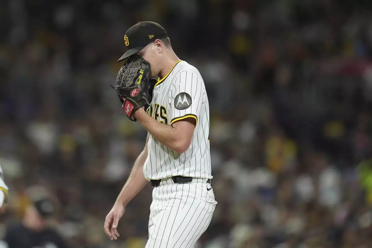 San Diego Padres starting pitcher Nick Pivetta puts his face in his glove as he walks back onto the mound during the fourth inning of a baseball game against the Milwaukee Brewers Monday, Sept. 22, 2025, in San Diego. (AP Photo/Gregory Bull)