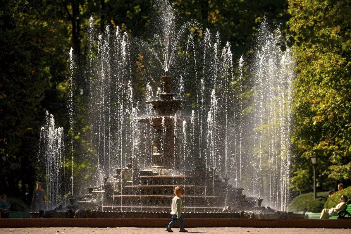 A child walks past a city fountain in a park in Chisinau, Moldova, Tuesday, Sept. 23, 2025. (AP Photo/Vadim Ghirda)