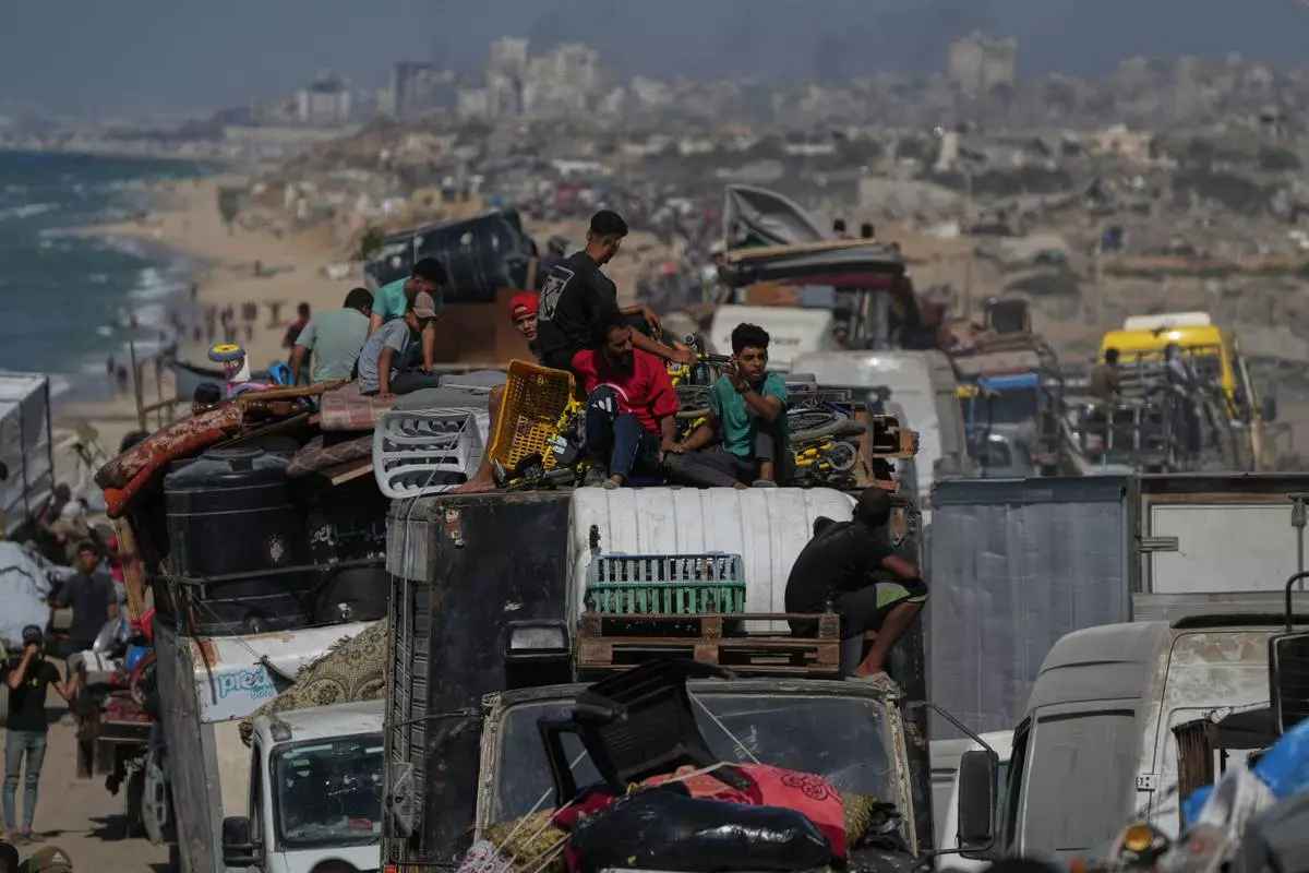 Displaced Palestinians flee northern Gaza Strip, by foot and in vehicles, carrying their belongings along the coastal road, near Wadi Gaza, Tuesday, Sept. 23, 2025. (AP Photo/Abdel Kareem Hana)