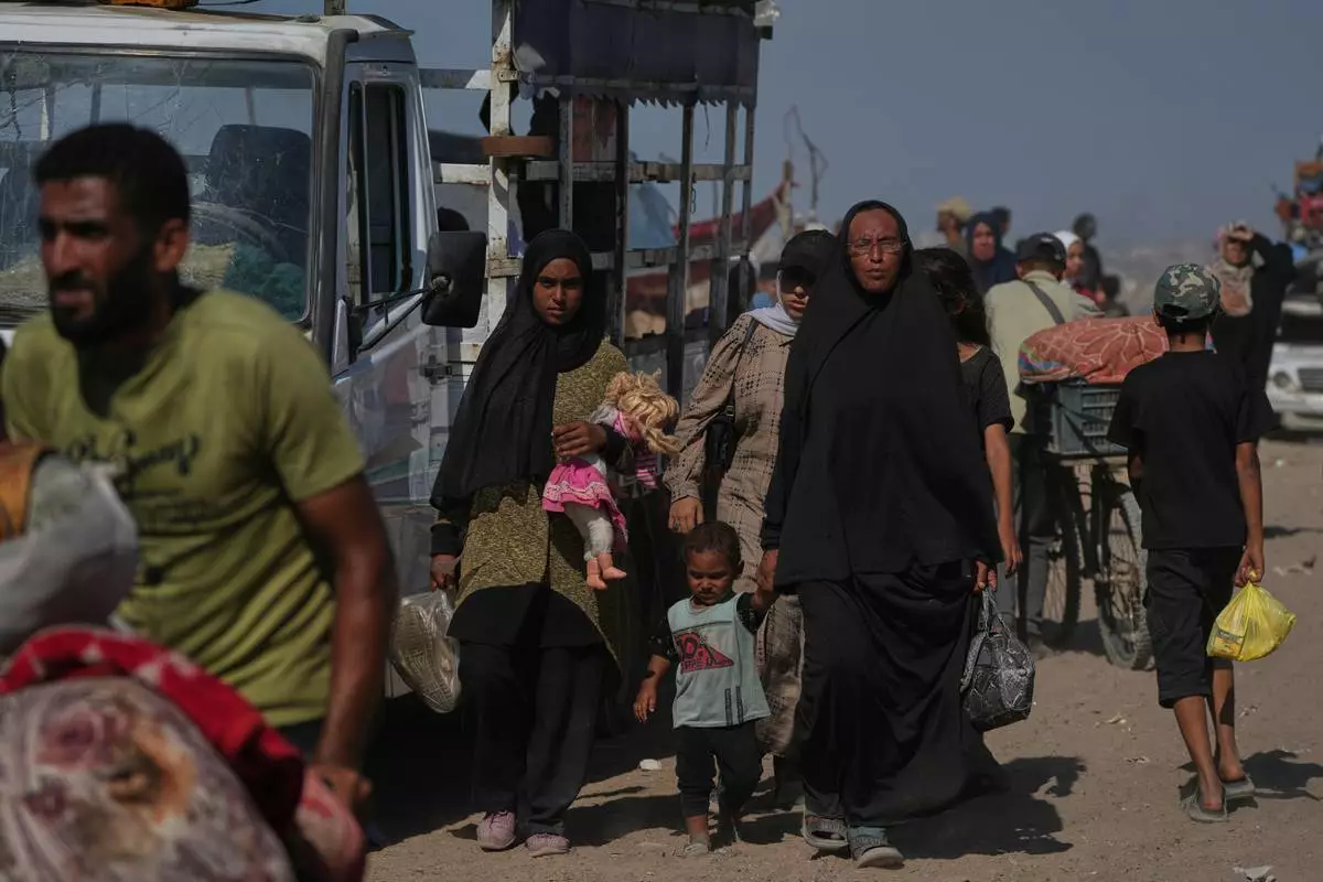 Displaced Palestinians flee northern Gaza Strip, carrying their belongings along the coastal road, near Wadi Gaza, Tuesday, Sept. 23, 2025. (AP Photo/Abdel Kareem Hana)