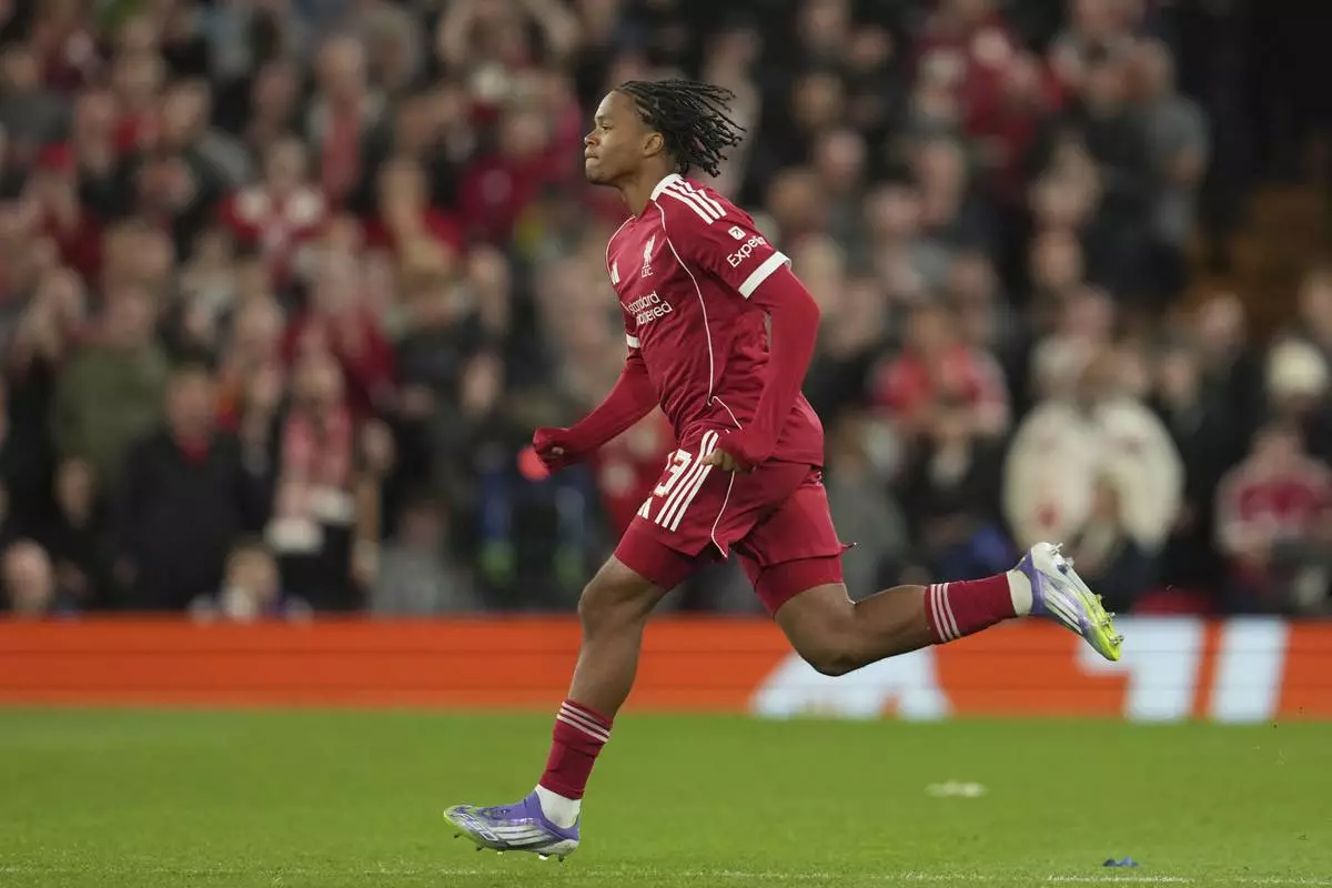 Liverpool's Rio Ngumoha runs during the Champions League opening phase soccer match between Liverpool and Atletico Madrid at Anfield stadium in Liverpool, England, Wednesday, Sept. 17, 2025. (AP Photo/Jon Super)