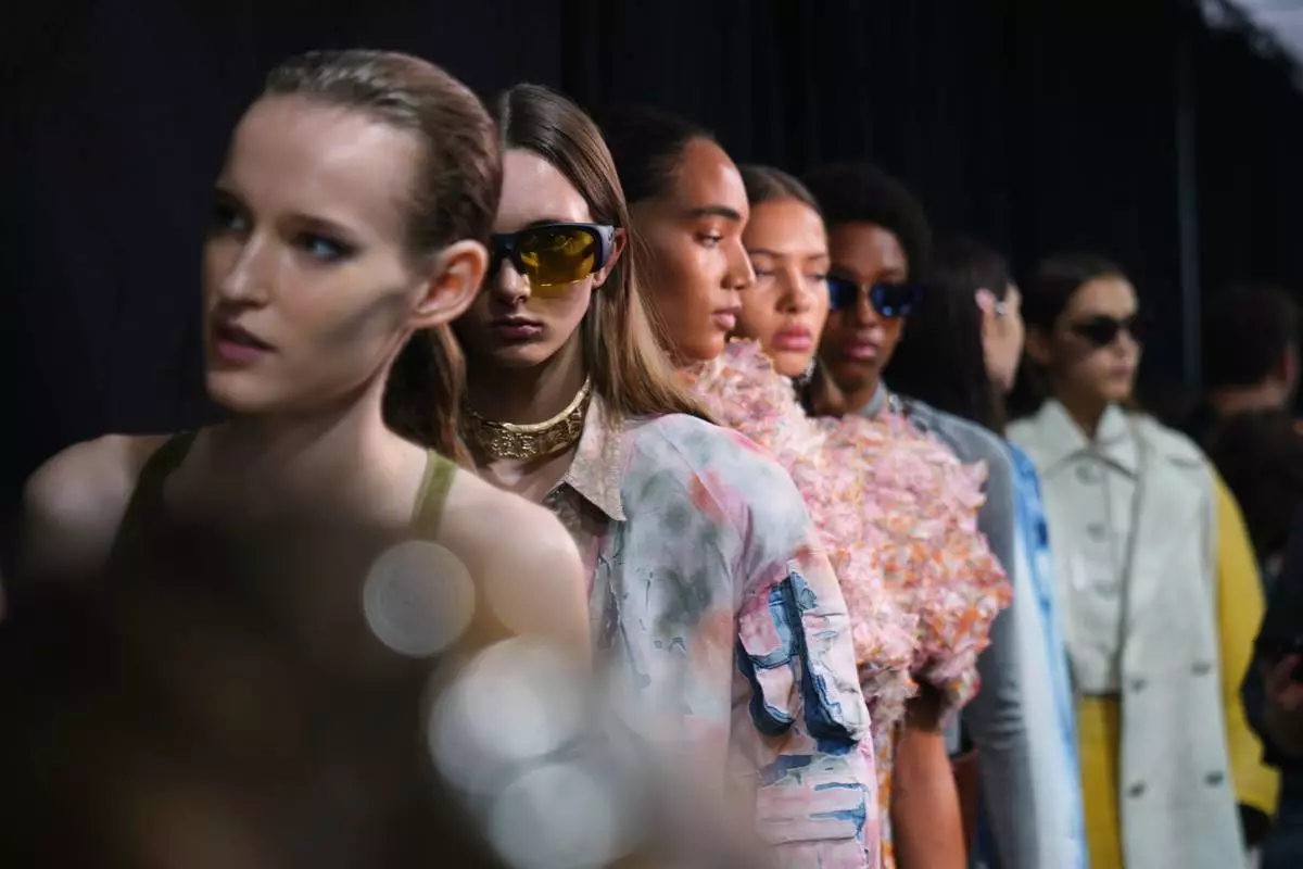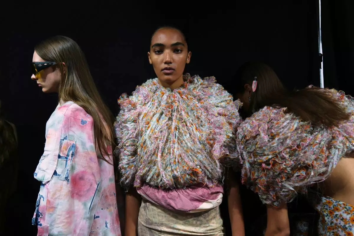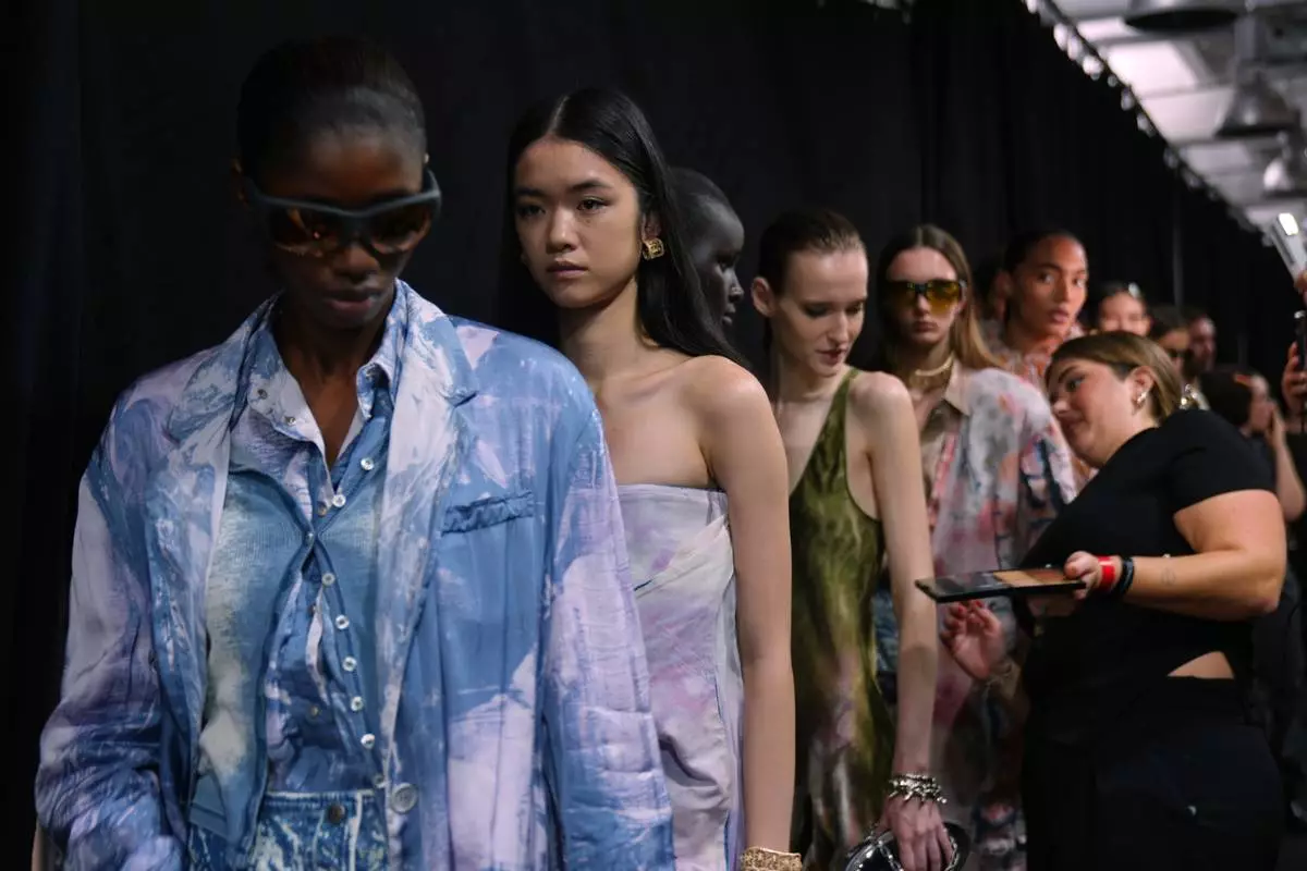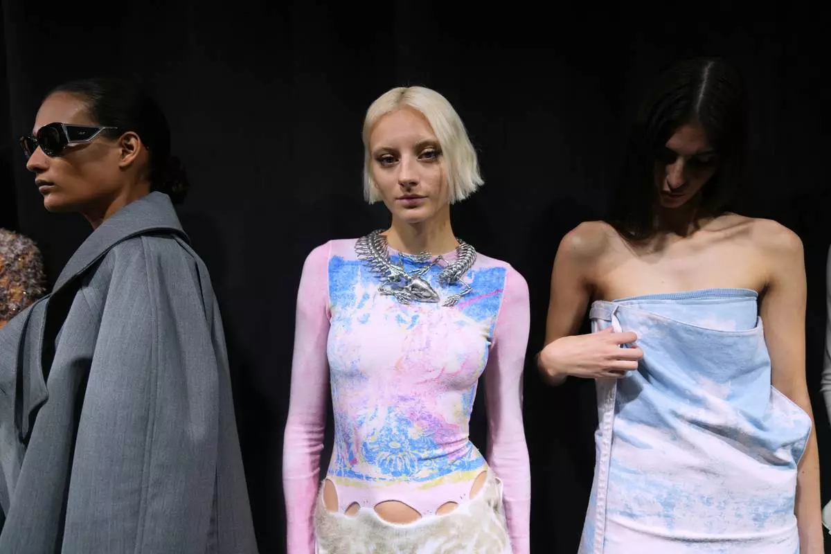 Models wear creations part of the Diesel's Spring Summer 2026 collection in the backstage ahead of the collection's show, in Milan, Italy, Tuesday, Sept. 23, 2025. (AP Photo/Antonio Calanni)