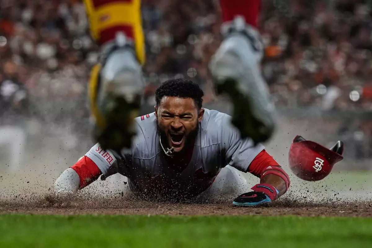 St. Louis Cardinals' Victor Scott II, bottom, scores against the San Francisco Giants on Brendan Donovan's double during the ninth inning of a baseball game, Tuesday, Sept. 23, 2025, in San Francisco. (AP Photo/Godofredo A. Vásquez)