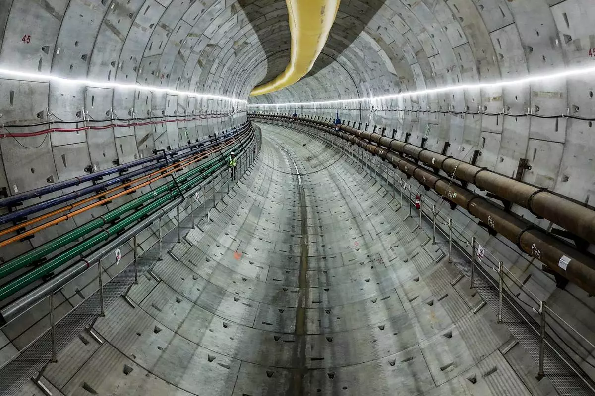 A construction worker makes his way along a track-level walkway in the metro tunnel beneath the Panama Canal during a media tour, in Arraijan, west of Panama City, Tuesday, Sept. 23, 2025. (AP Photo/Matias Delacroix)