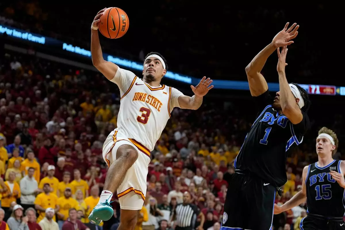 FILE - Iowa State guard Tamin Lipsey (3) drives to the basket past BYU guard Trey Stewart (1) during overtime in an NCAA college basketball game, March 4, 2025, in Ames, Iowa. (AP Photo/Charlie Neibergall, File)