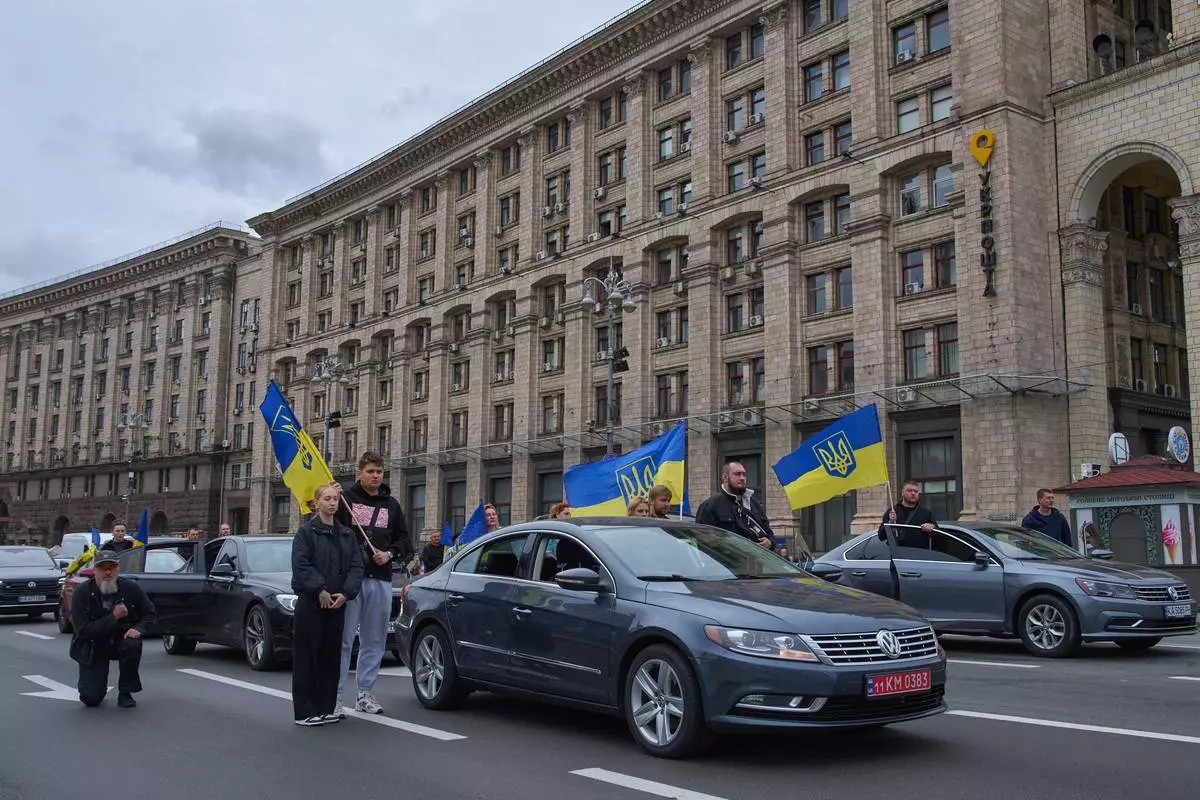 Motorists stop their cars to pay respect to a soldier who was killed in Russia-Ukraine war as a vehicle with his body drives along the city main Khreshchatyk Street in Kyiv, Ukraine, Wednesday, Sept. 24, 2025. (AP Photo/Efrem Lukatsky)