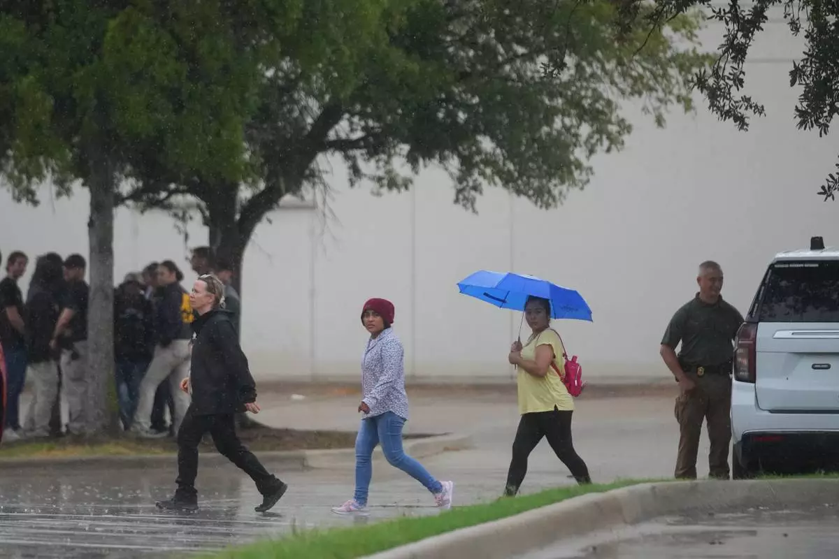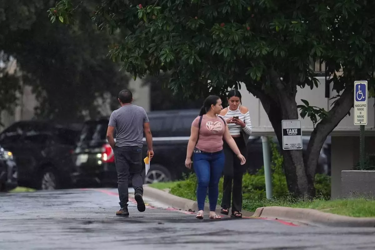 People who had appointments at a U.S. Immigration and Customs Enforcement office are turned away after a reported shooting in the facility in Dallas on Wednesday, Sept. 24, 2025. (AP Photo/Julio Cortez)